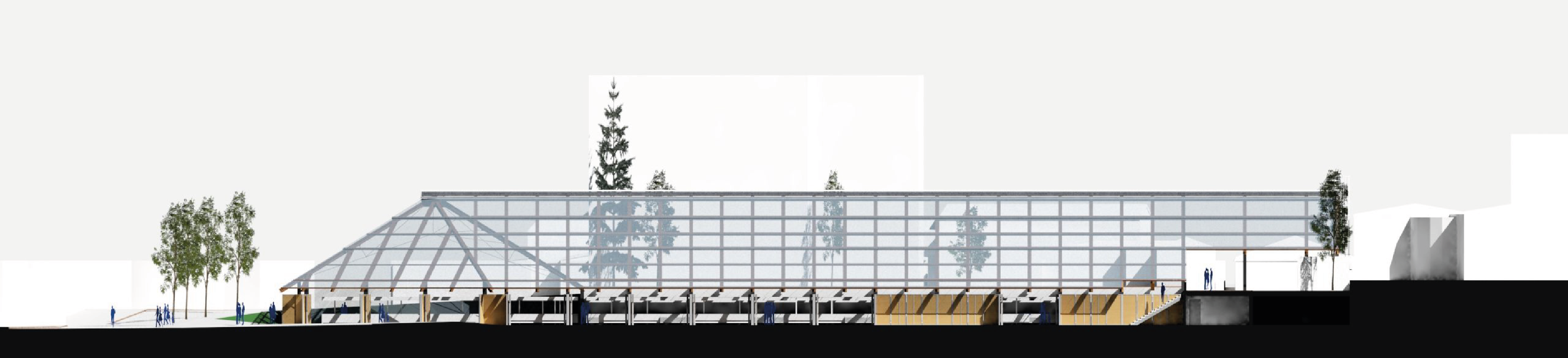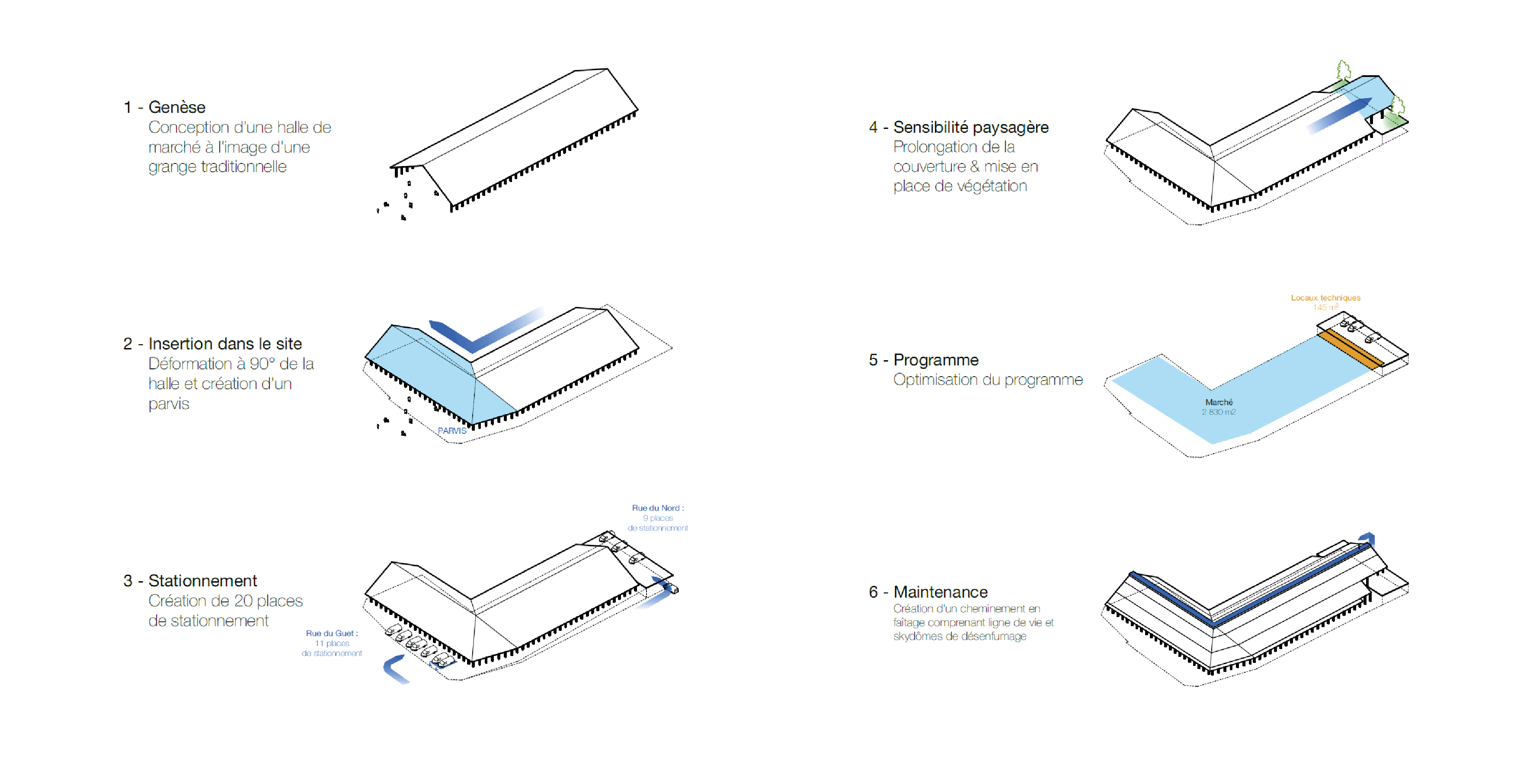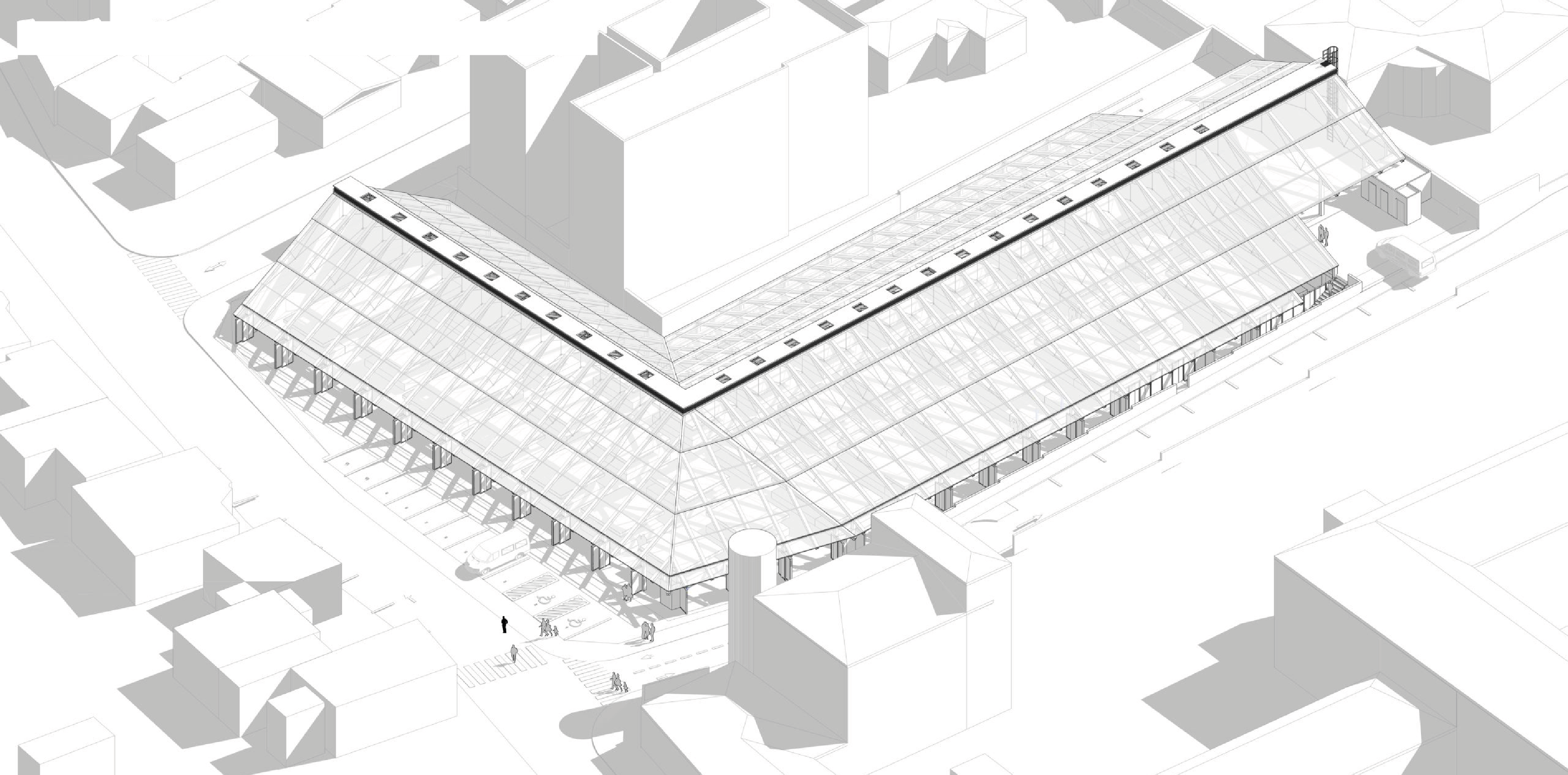 La halle se retourne à angle droit pour se conformer au tissu viaire. Cette forme en équerre génère une intériorité pour le marché et permet d’organiser et de séquencer les espaces commerciaux.