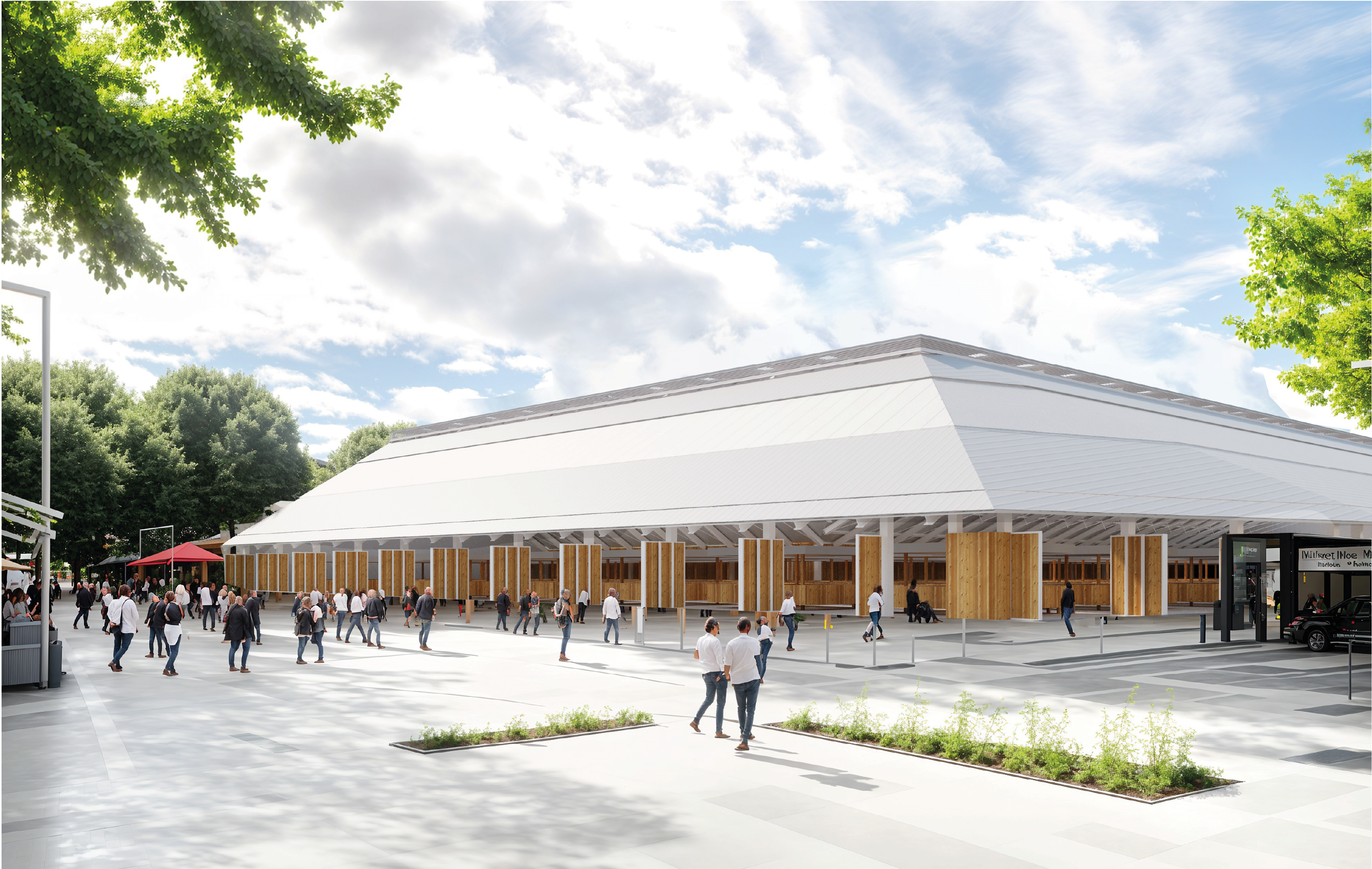 Le bâtiment est implanté en retrait de la circulation automobile afin constituer un parvis qui permet l’accolement des véhicules des commerçants qui approvisionnent avant l’ouverture du marché au public.