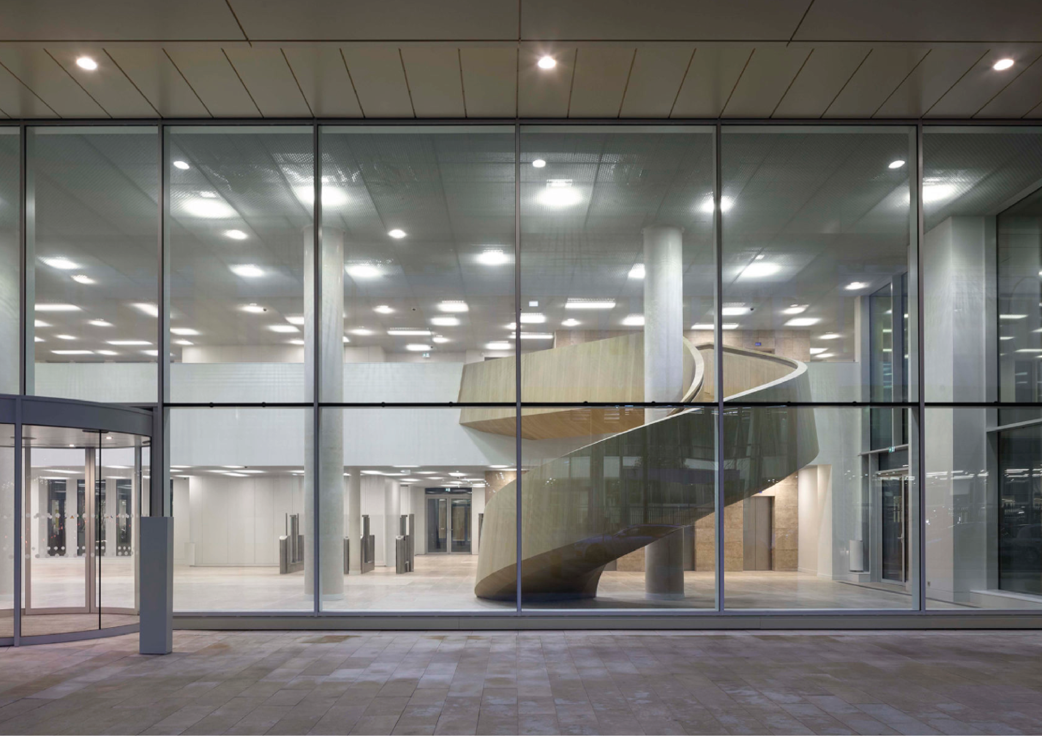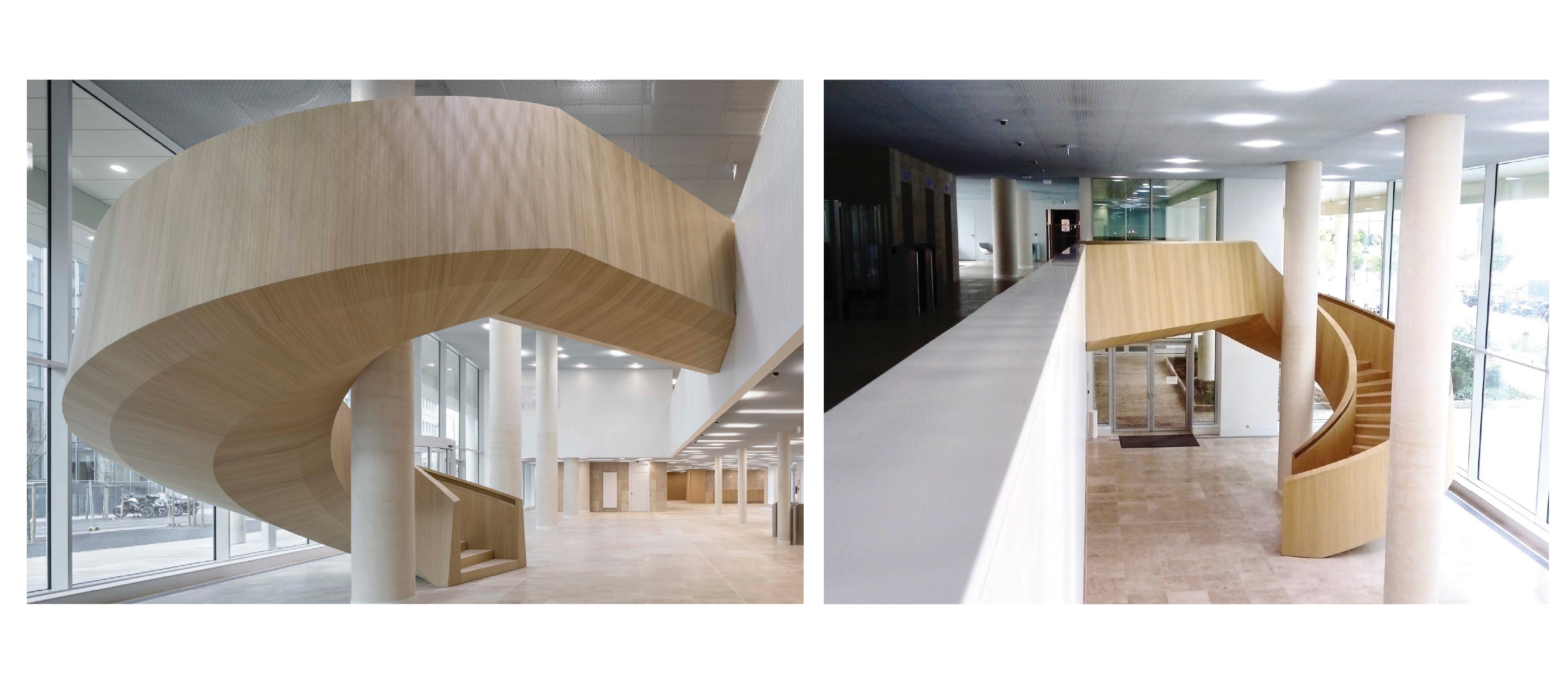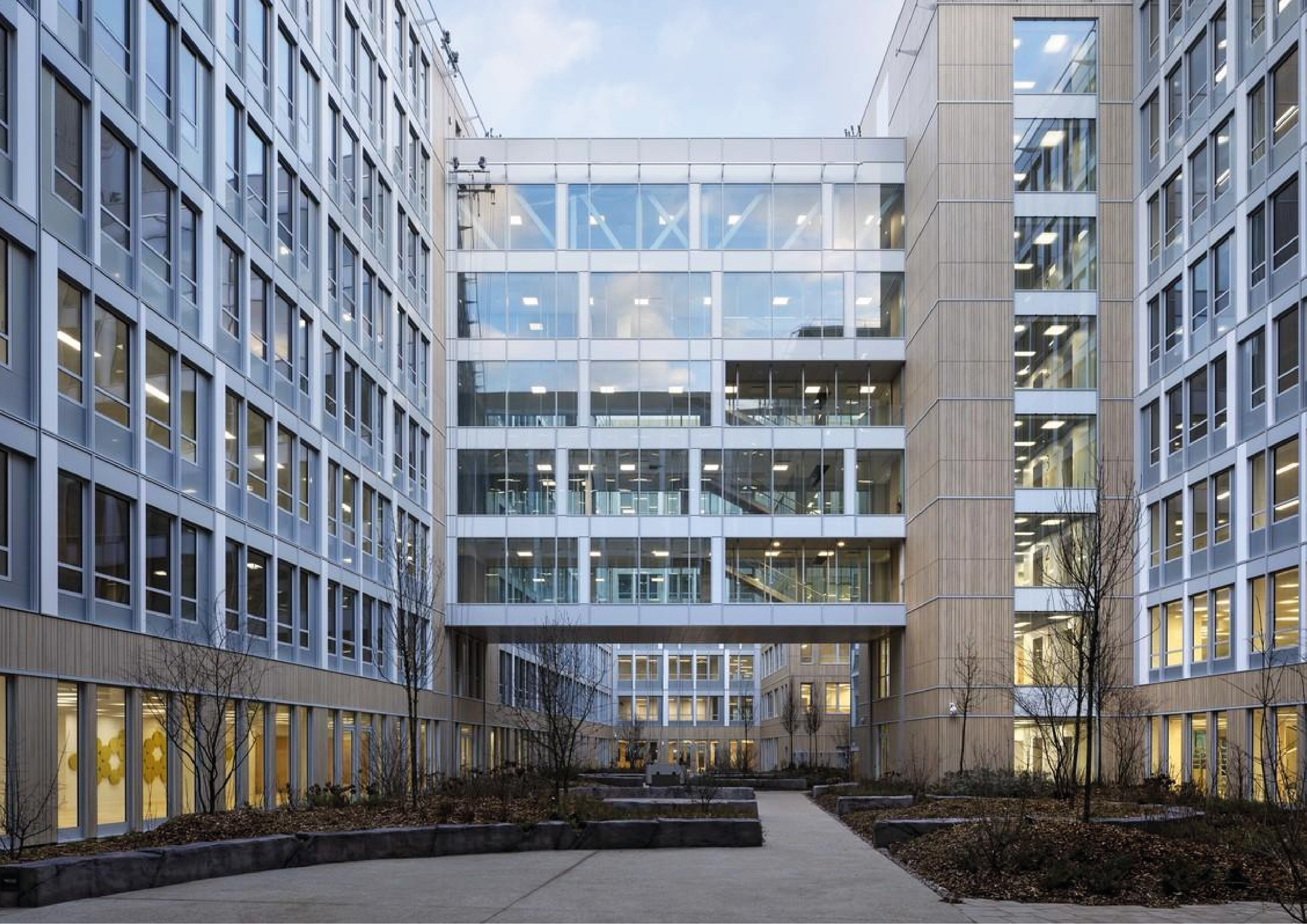 Conçu par l’agence Quadrifiore autour d’un grand jardin central, le bâtiment offre une grande transparence avec une vue sur les espaces arborés en tous points. Un grand banc en béton serpente dans le jardin et constitue le « fil d’Ariane » de cet espace extérieur, en adoptant plusieurs fonctions (assise, tablette, éclairage, support de végétation).
