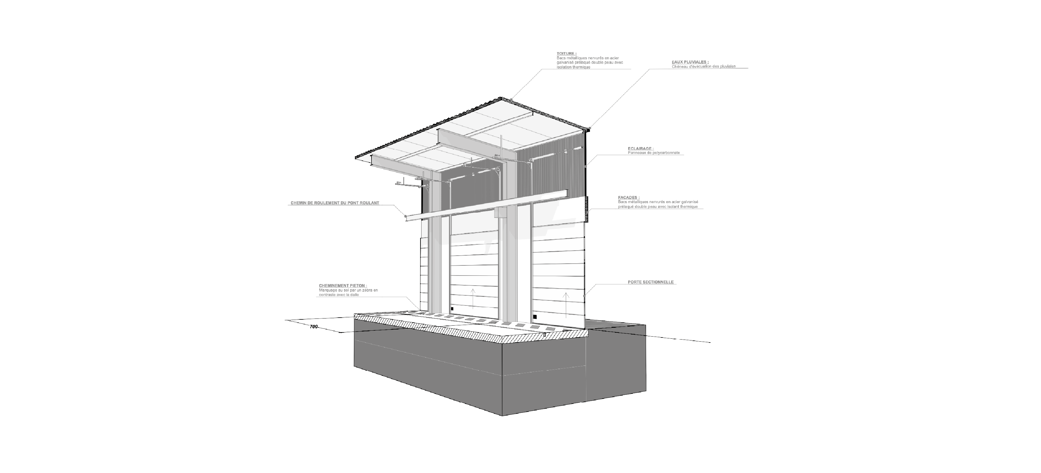 La confirmation, du point de vue architectural et structurel, de la volumétrie générale du bâtiment existant. En remplaçant les 6 dernières travées existantes par 4 nouvelles travées adaptées aux nouveaux véhicules blindés, la possibilité de préservation de la géométrie, et plus particulièrement celle de la toiture de la halle, résonne comme une