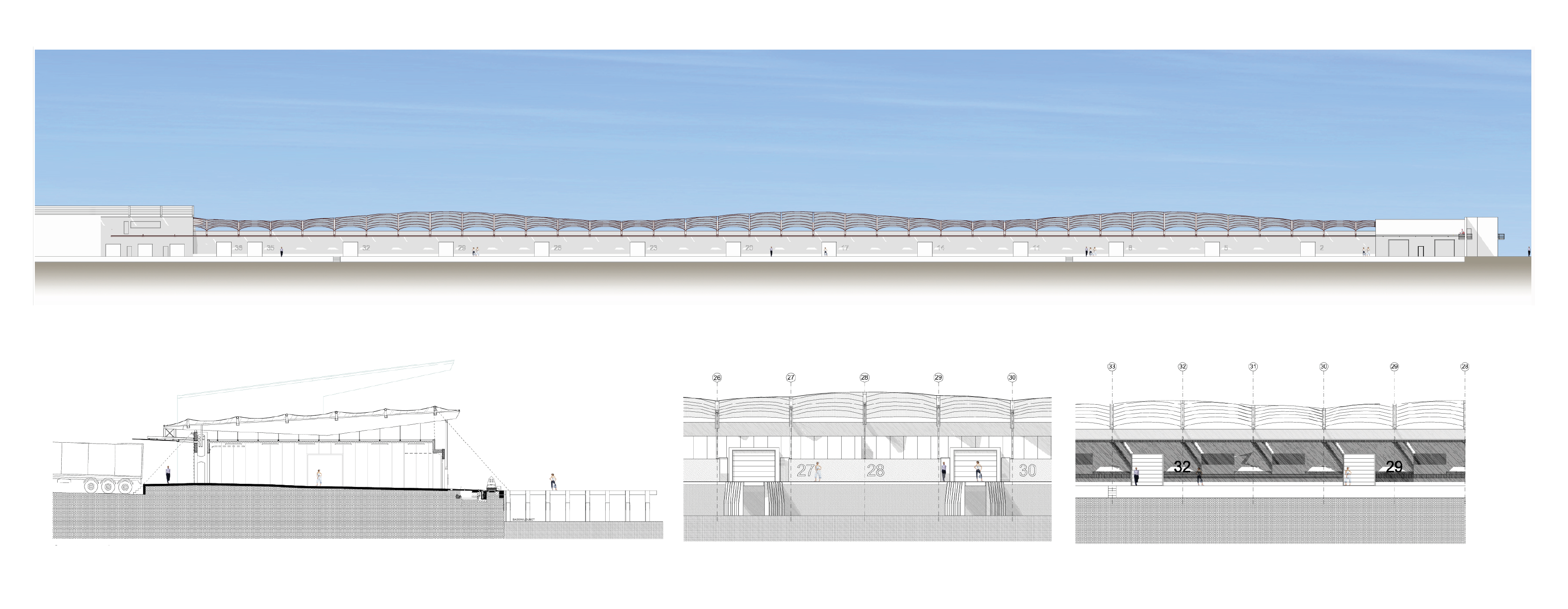 Les métaphores marines, la houle, la voile, constituent un hommage aux travailleurs de la mer. Des appareils d’éclairage électriques sont installés dans la charpente afin d’assurer d’une part un bon niveau d’éclairement des quais la nuit et d’autre part pour éclairer et mettre en scène la couverture textile. La dissociation structurelle entre la couverture et les unités frigorifiques laisse la lumière traverser la largeur du bâtiment et fait « flotter » la toile au dessus du bassin.