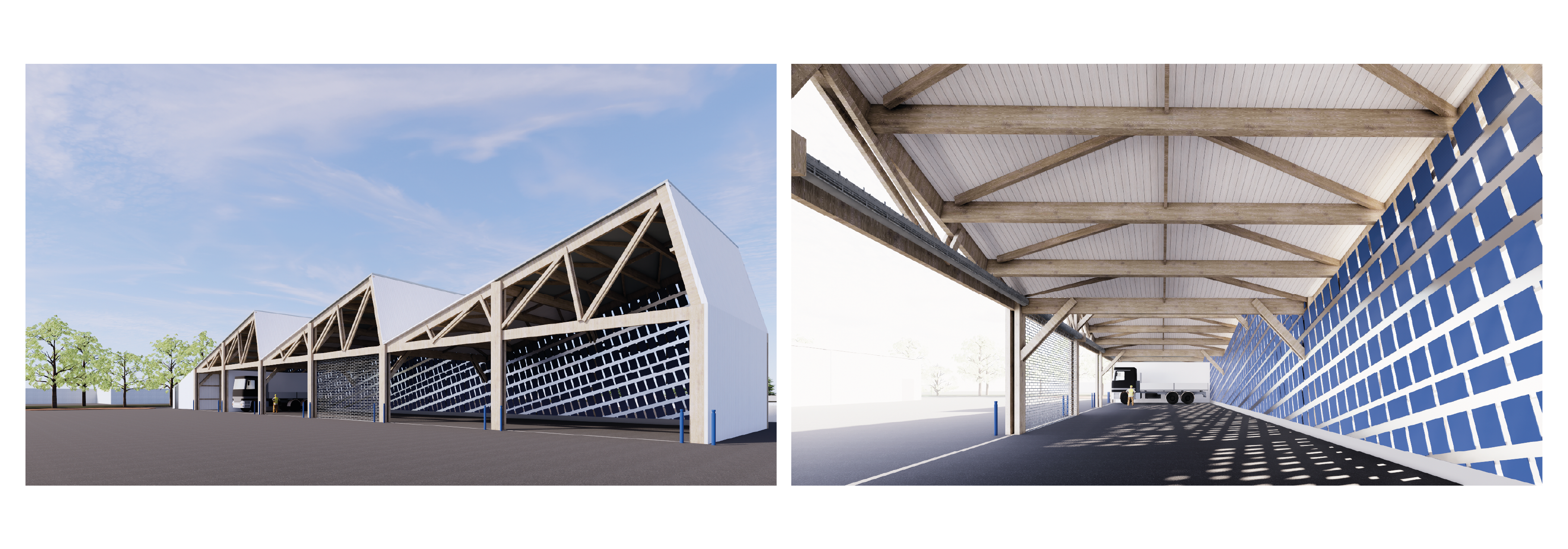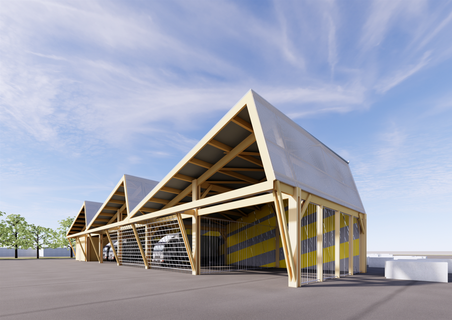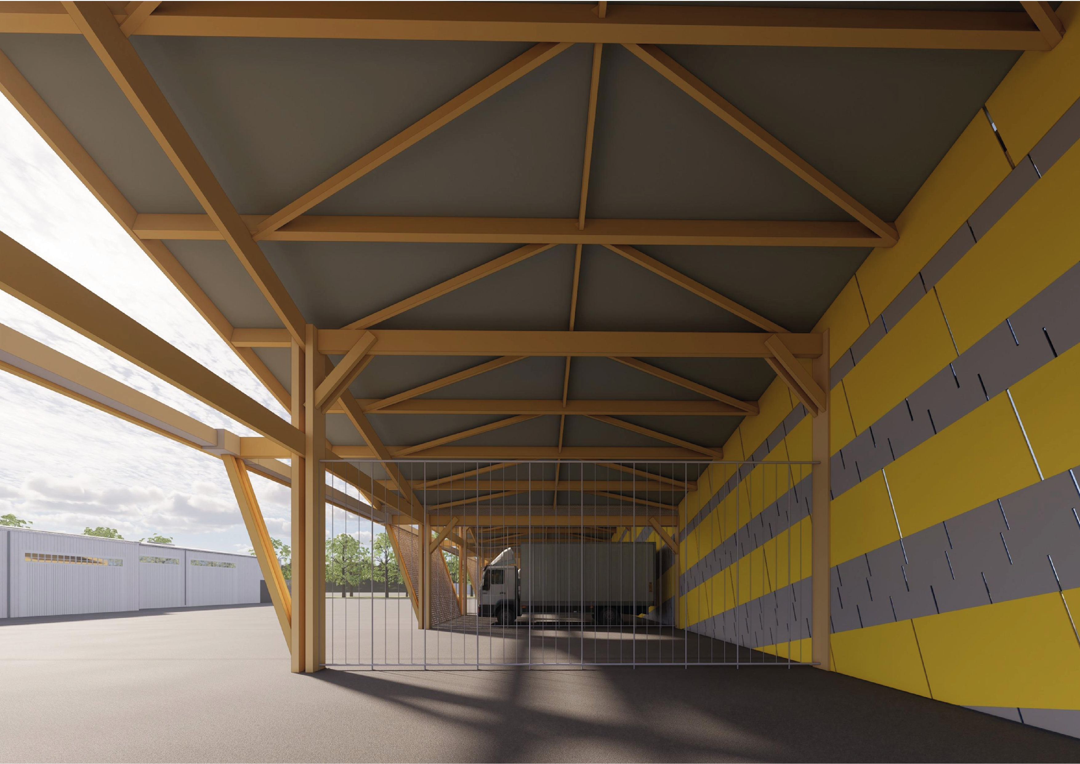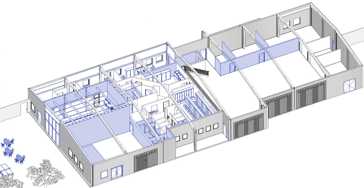 En plus de sa fonction de plateforme logistique pour les matériaux nécessaires aux travaux de voirie (bordures de trottoir, granulats, panneaux de signalisation…), le site est utilisé par les agents territoriaux matin, midi et soir pour s’équiper et recevoir les briefings en début de journée, se restaurer et se reposer lors de la pause méridienne, et se déséquiper le soir. En vue d’accueillir une dizaine d’agents supplémentaires, le site va être entièrement reconfiguré avec un redimensionnement et une réorganisation de tous les locaux de vie, le déplacement des zones de stockage, et la construction d’un abri semi-fermé. L’enveloppe de celui-ci sera constituée de panneaux de signalisation réemployés, sourcés sur la plateforme.